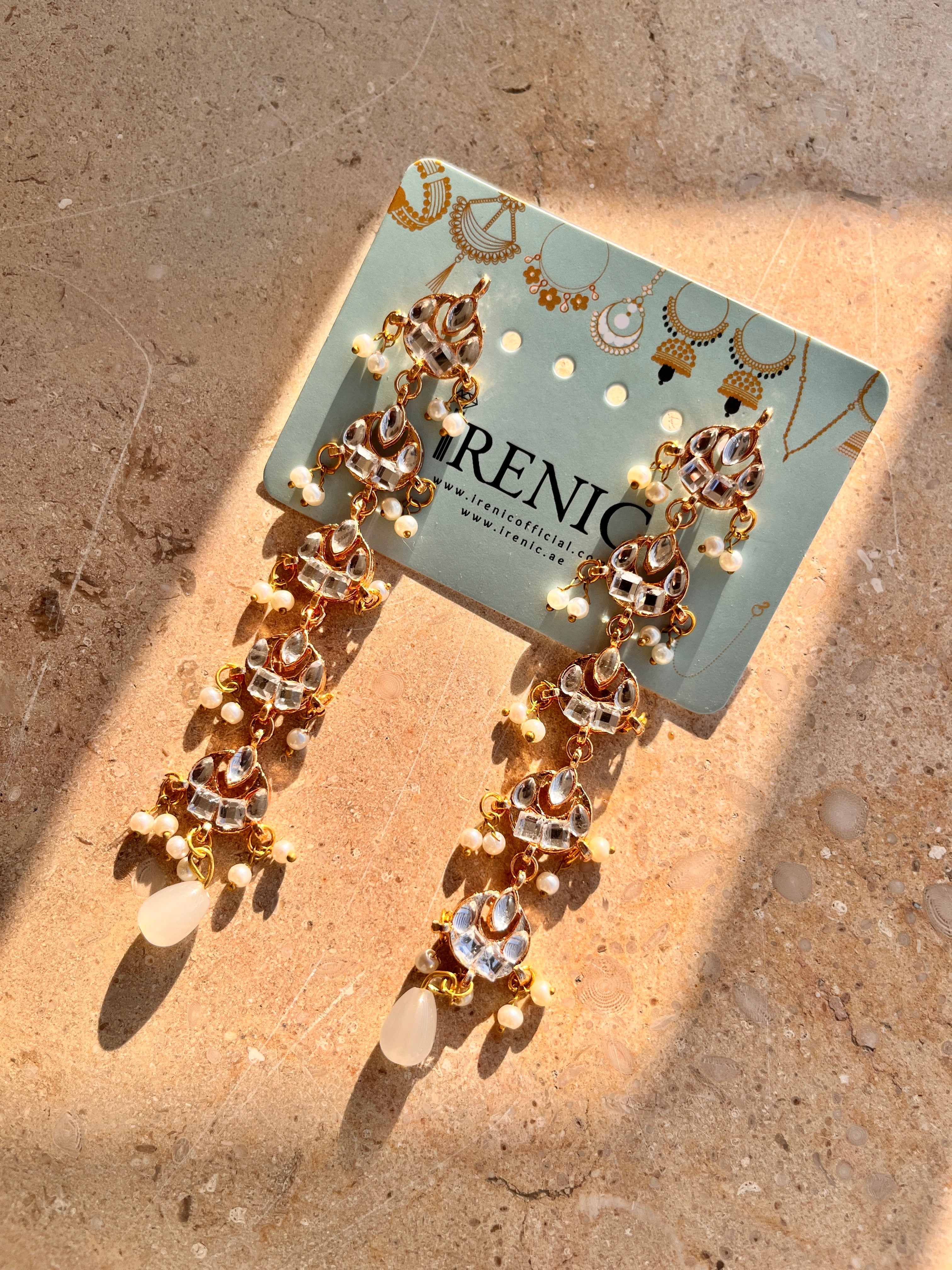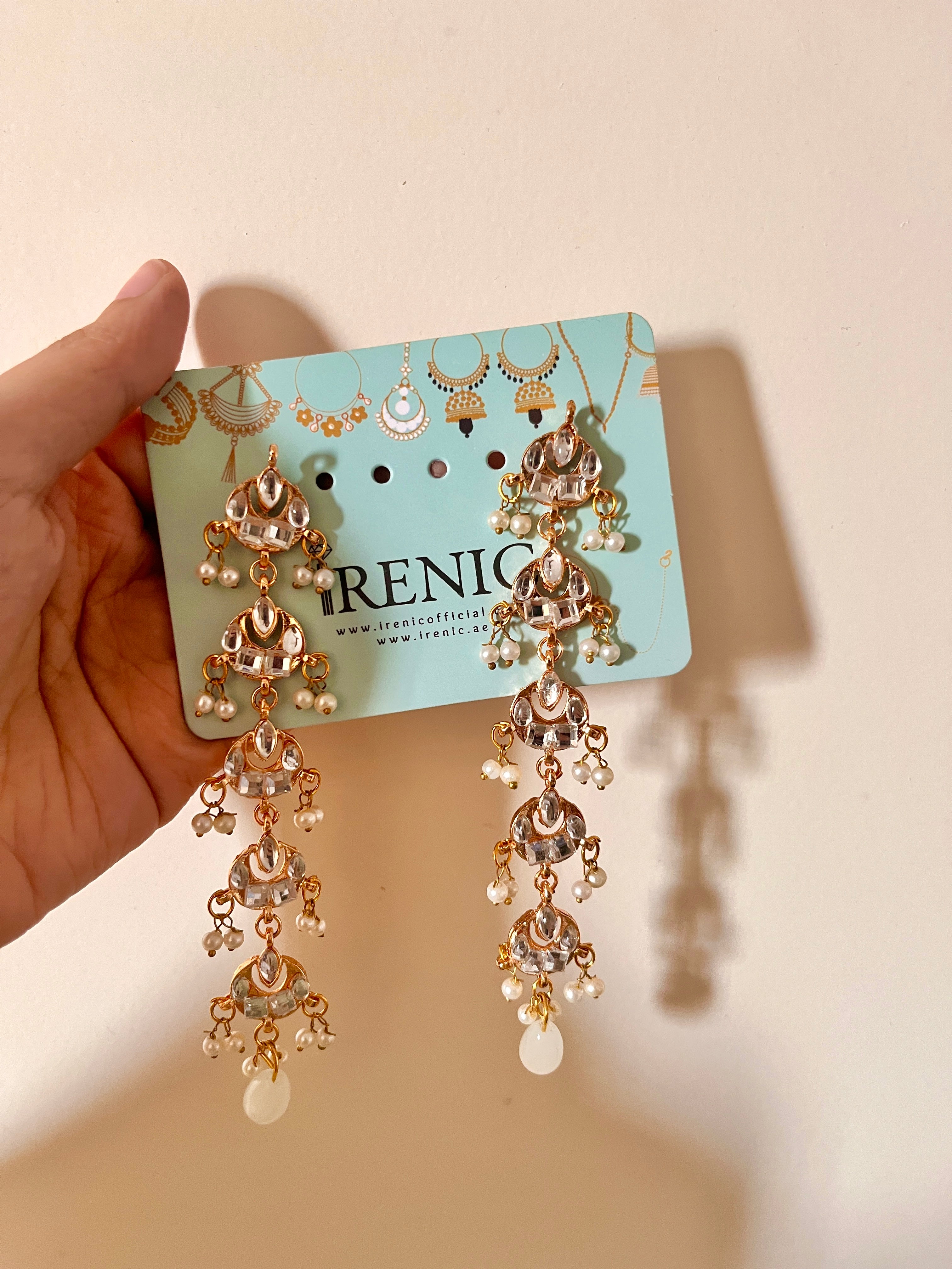 Gold and silver plated kundan work step earrings with pearls.