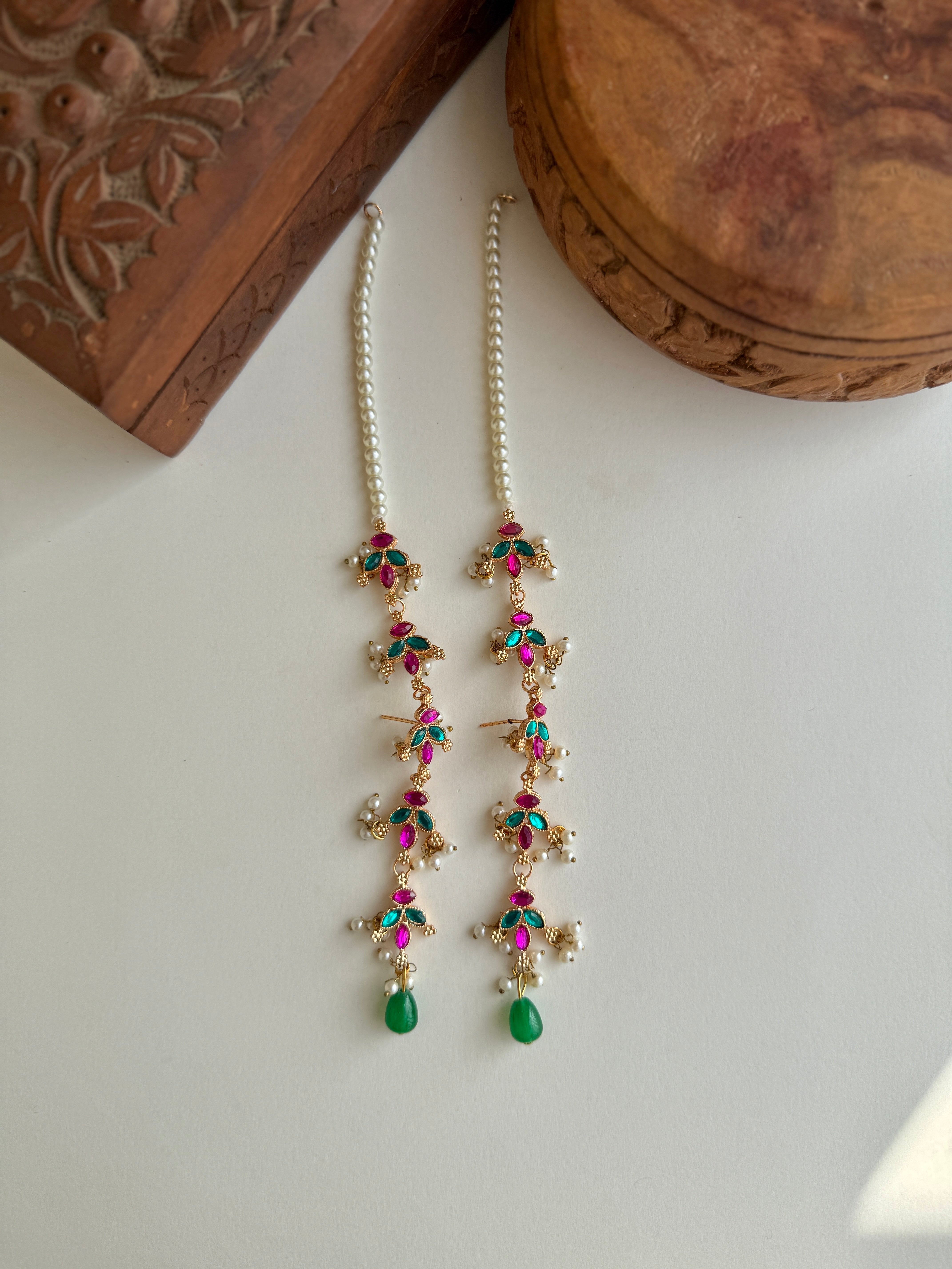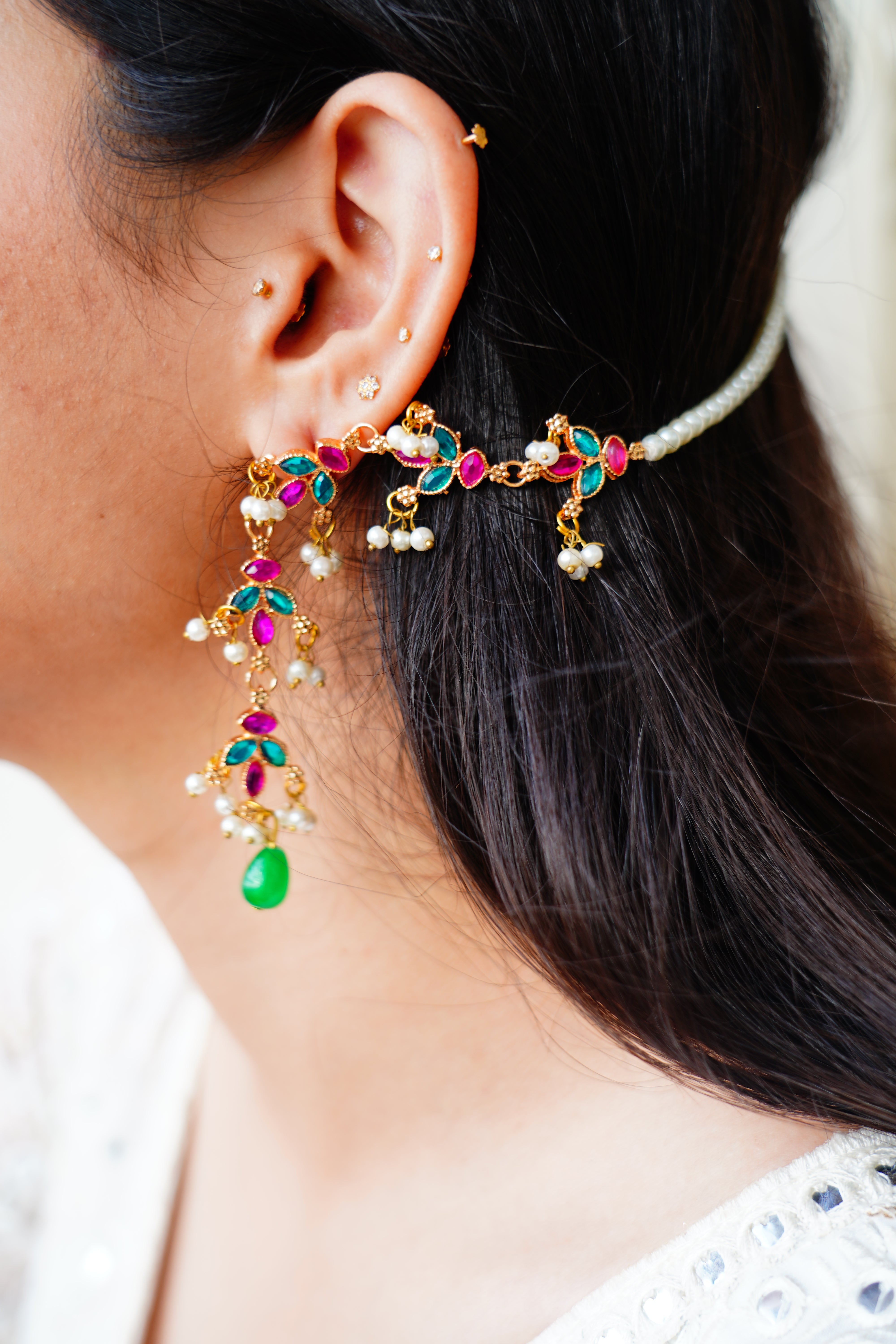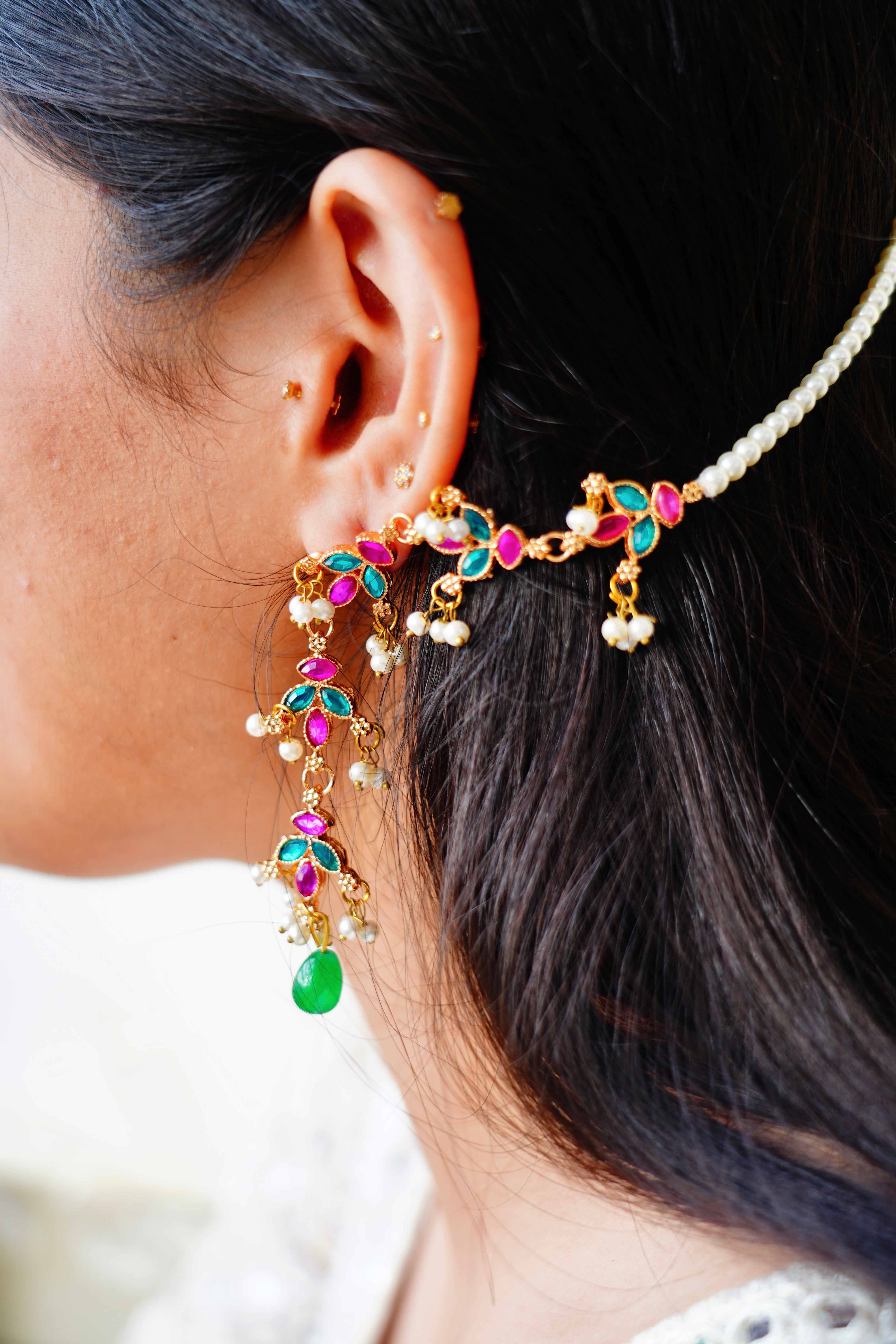 Petal kundan earrings with attached saharas to create a full ear stack look.
