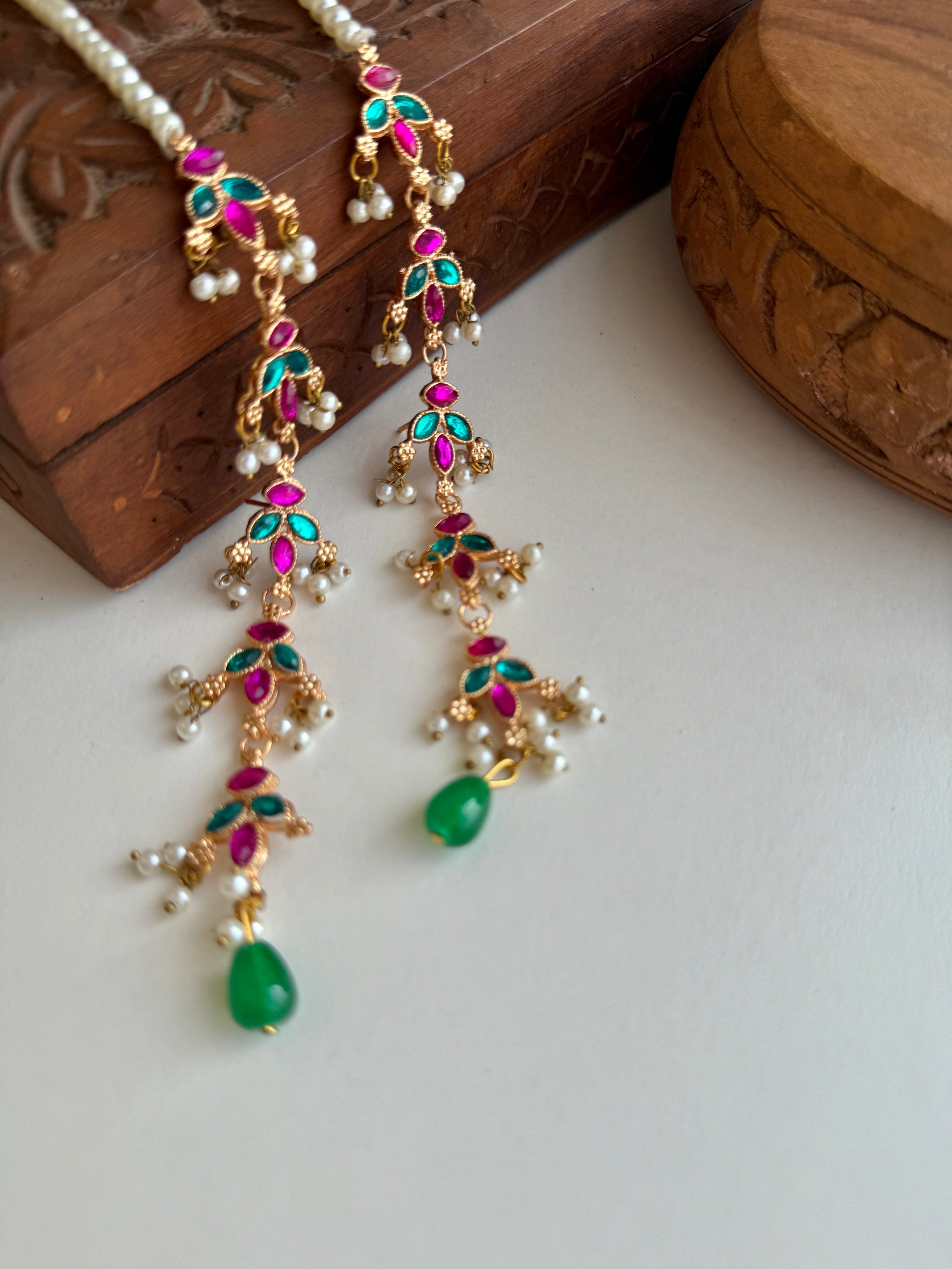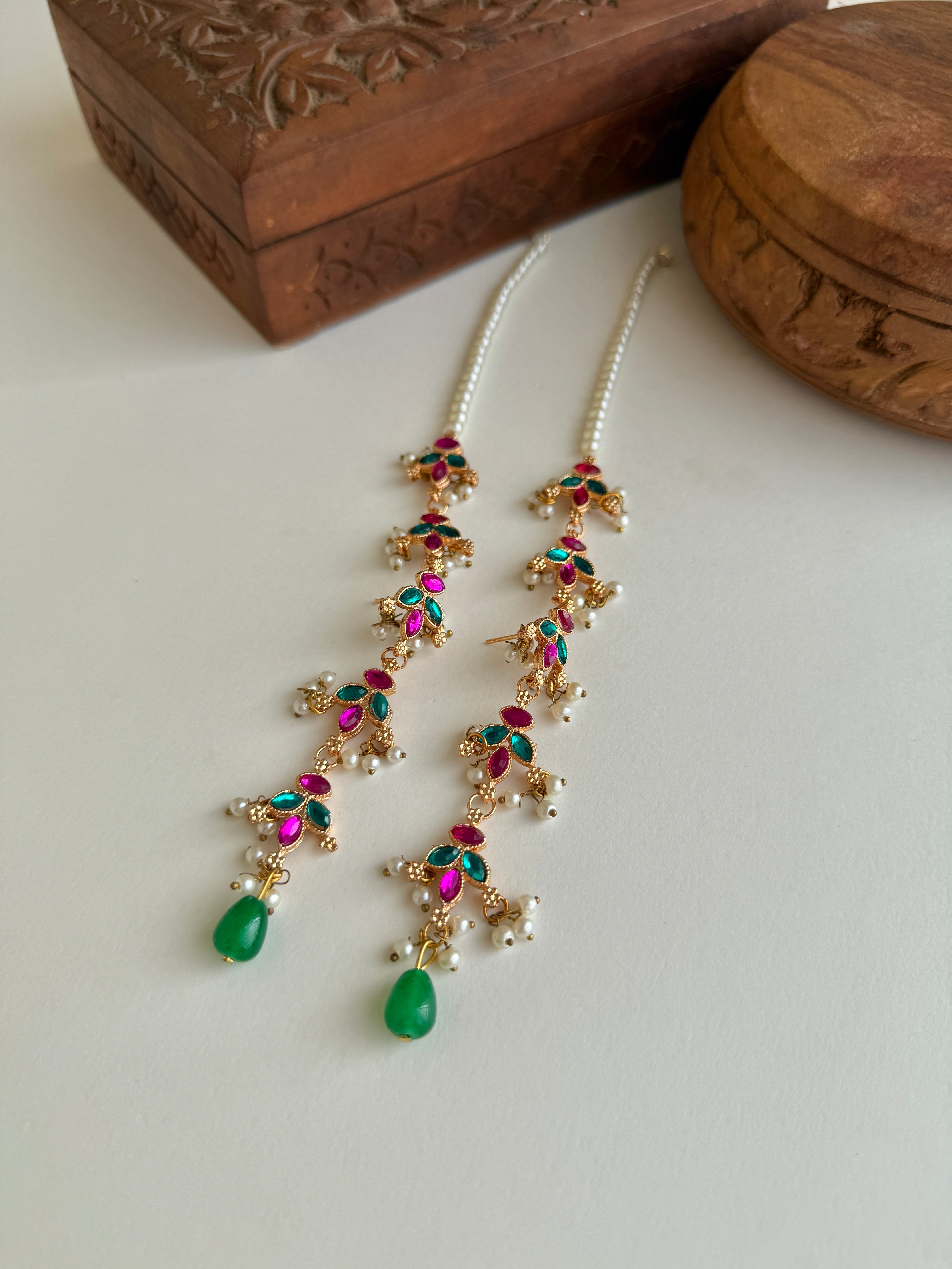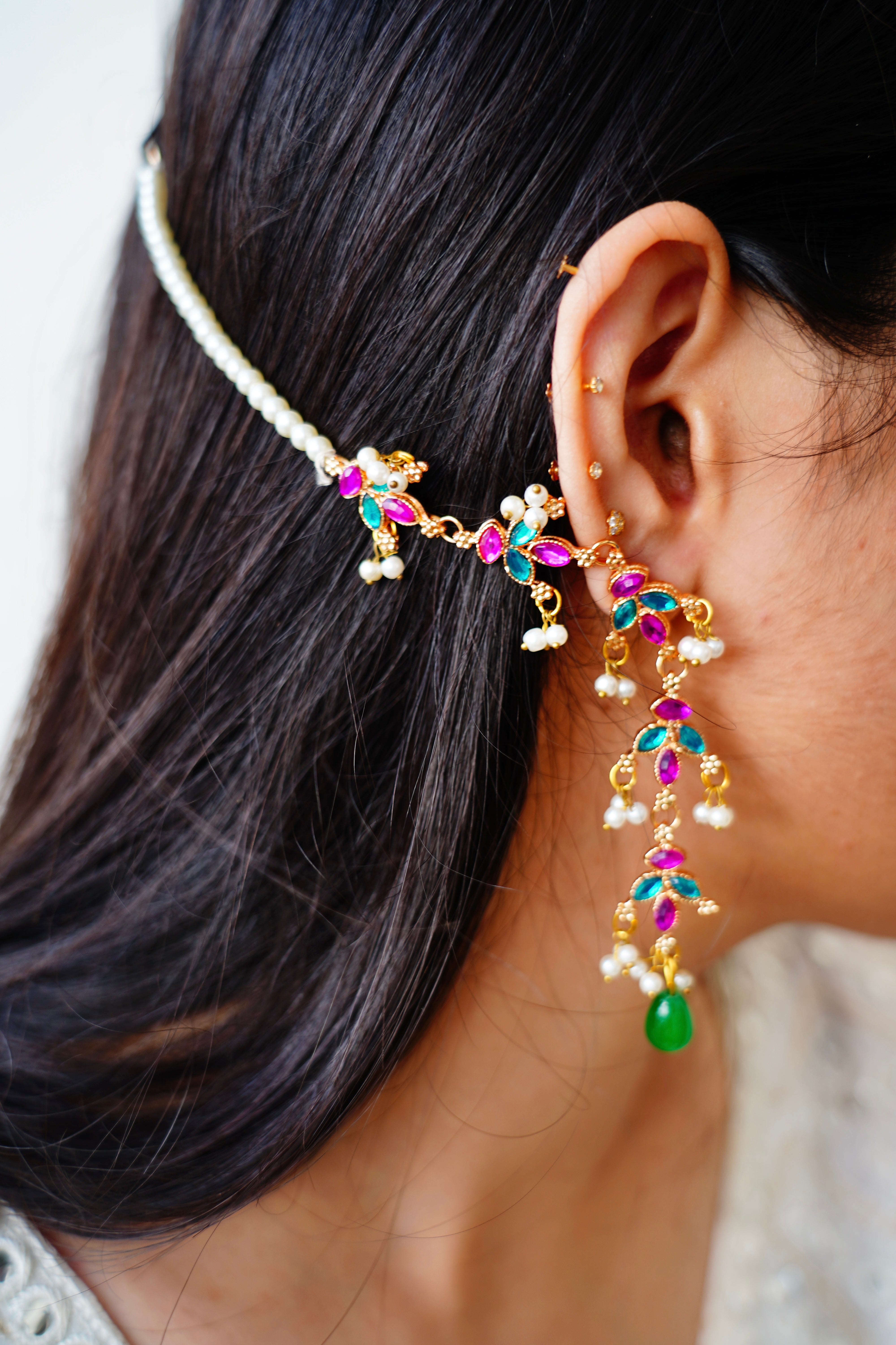 Petal kundan earrings with attached saharas to create a full ear stack look.