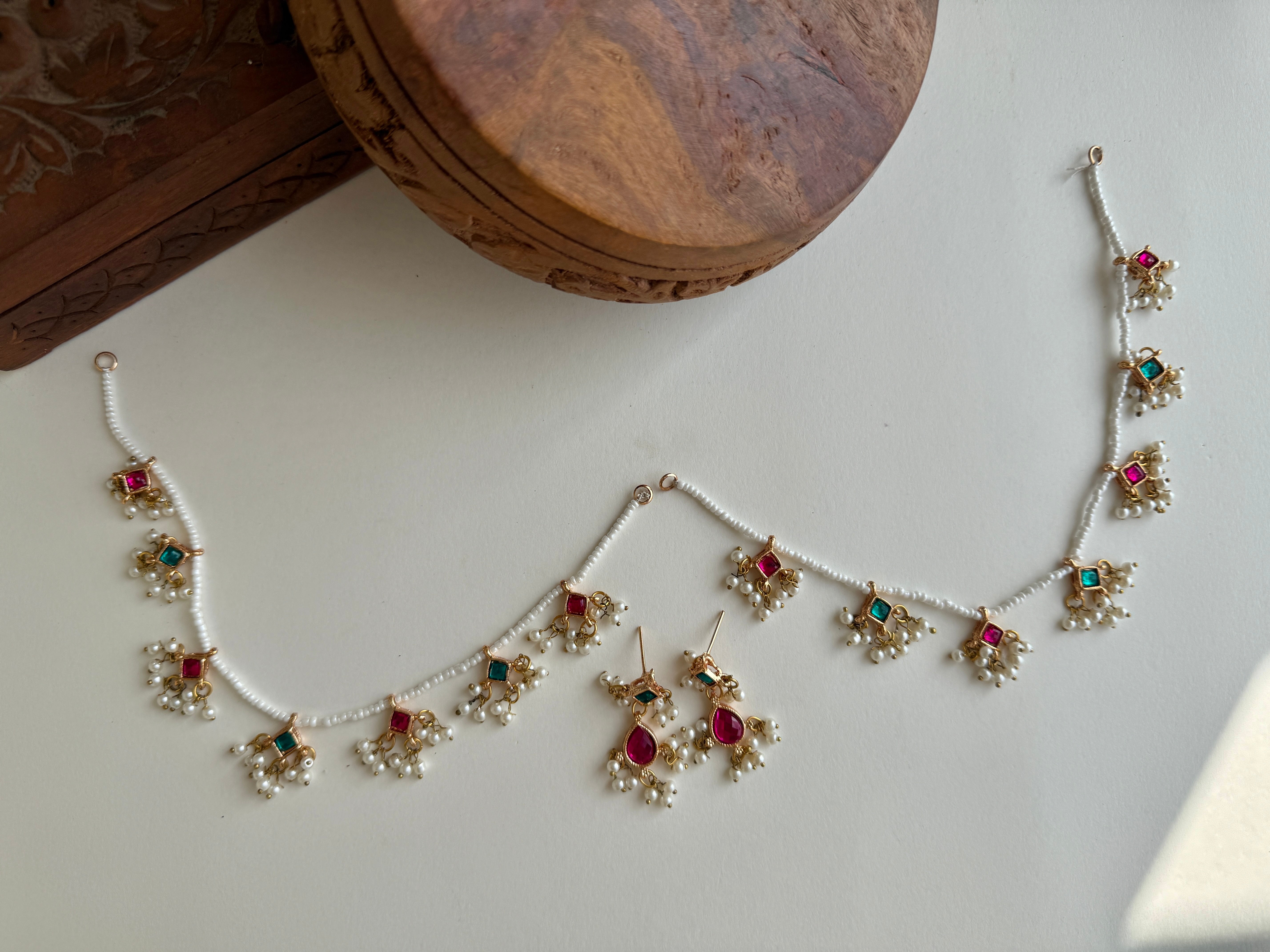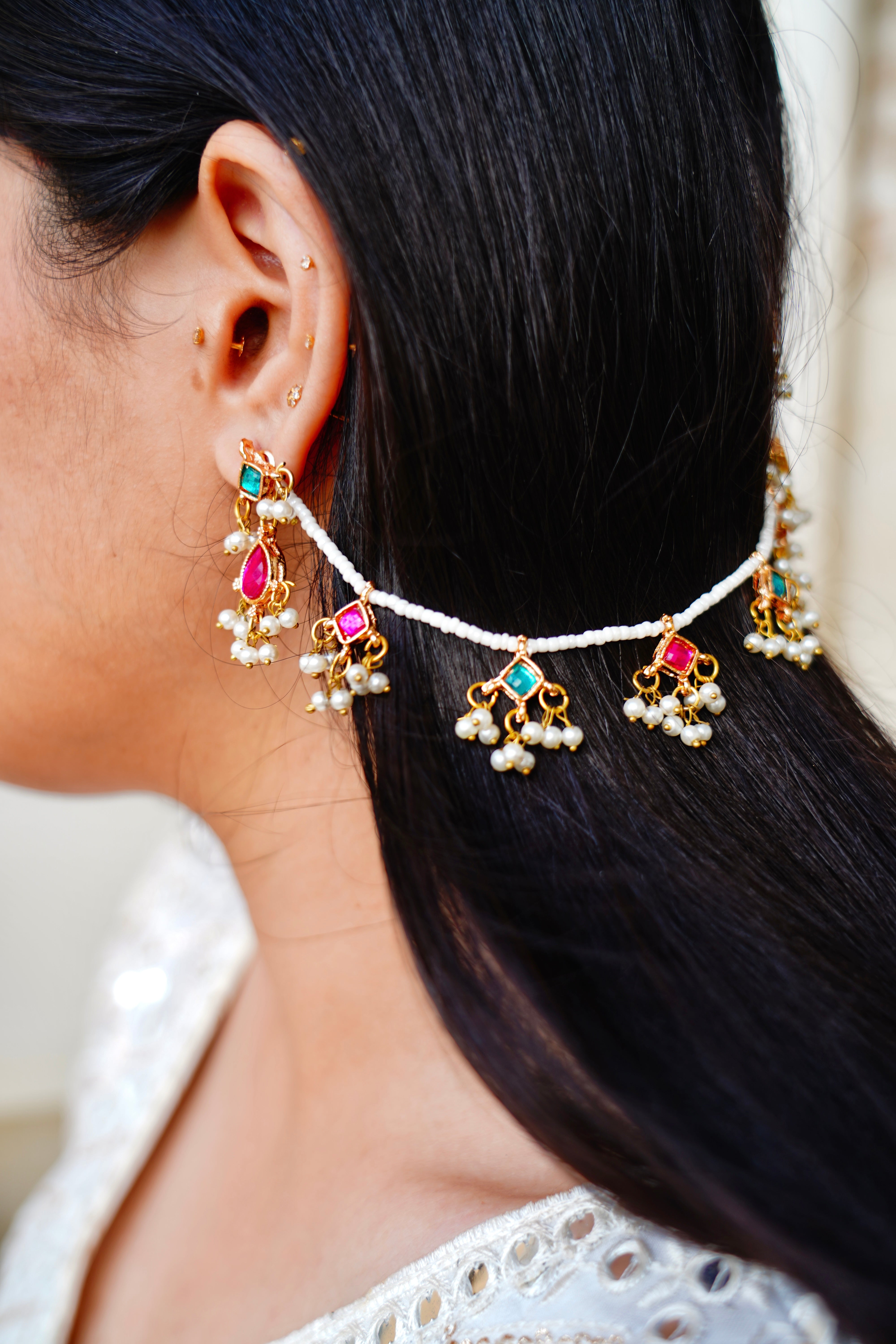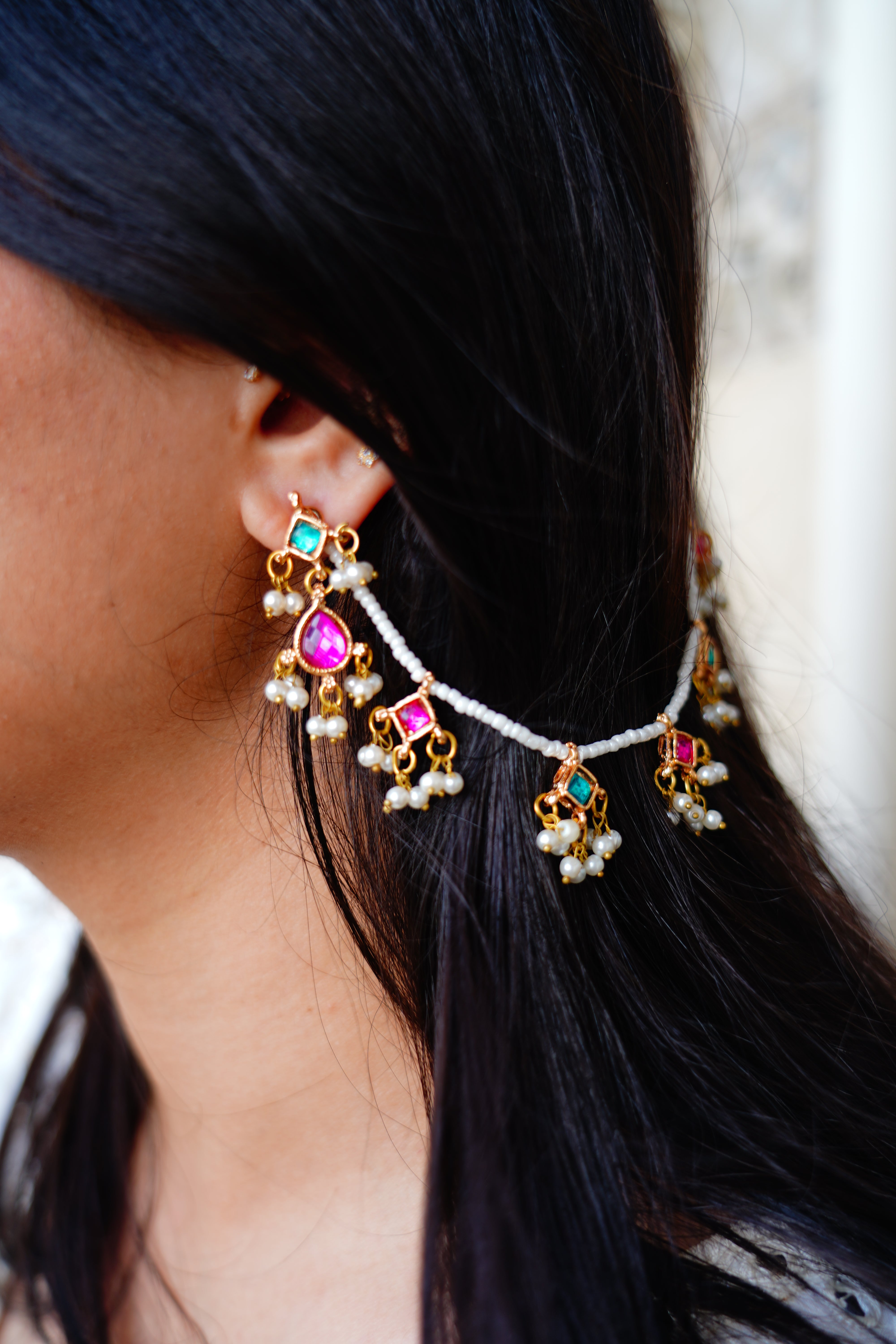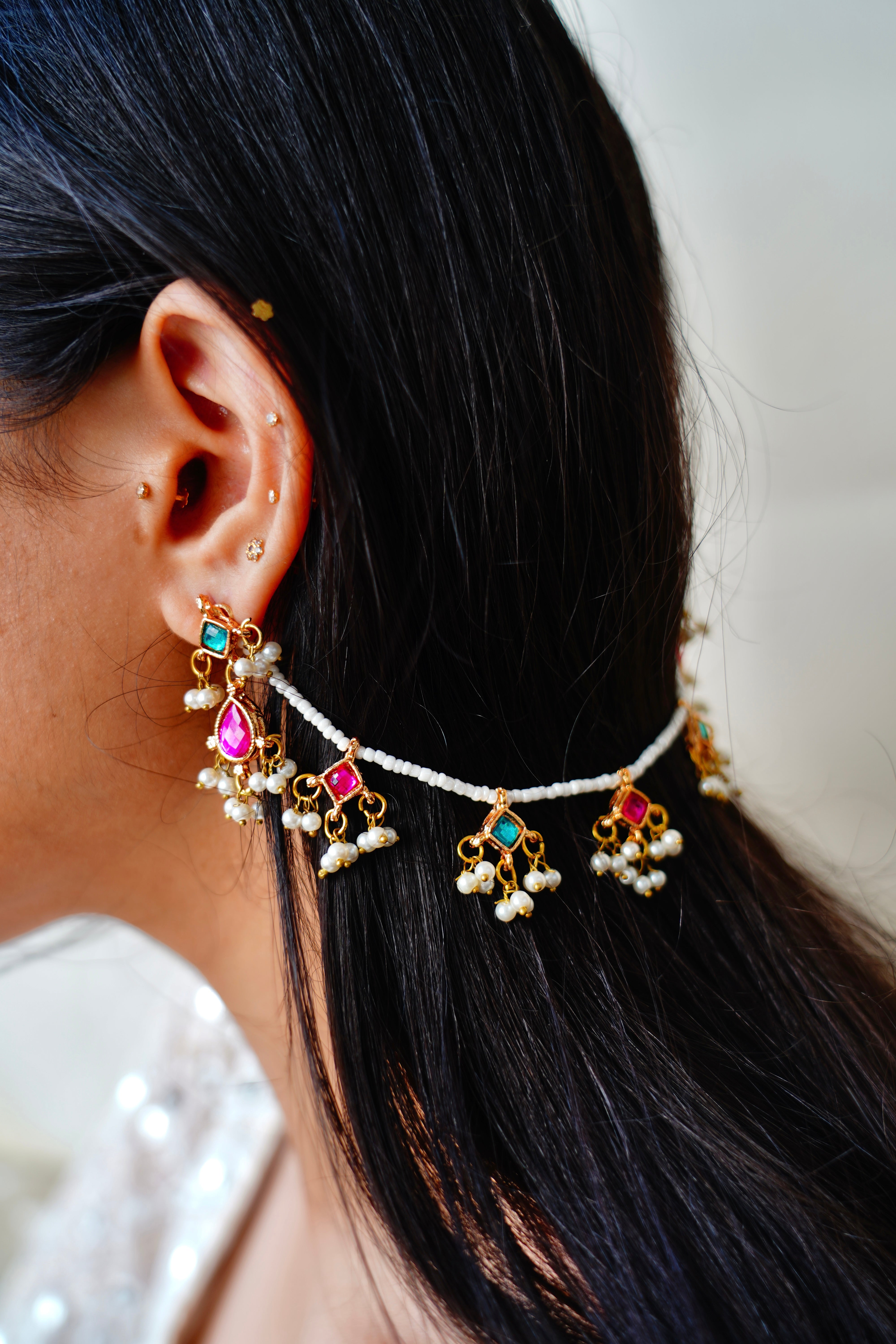 Kundan work blended with pearls. Mini jhumkis paired with beautiful removable saharas that could be styled in multiple ways.