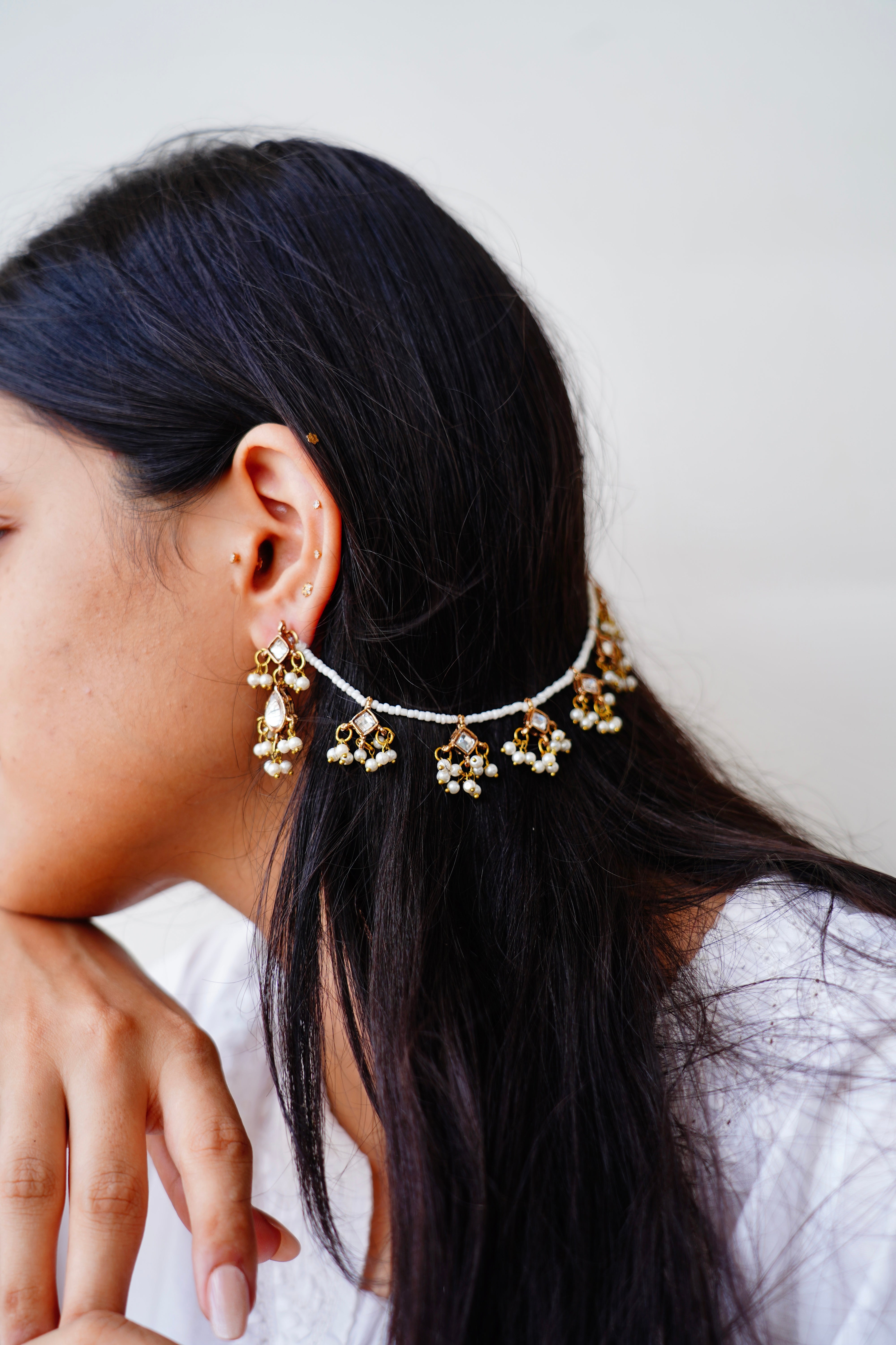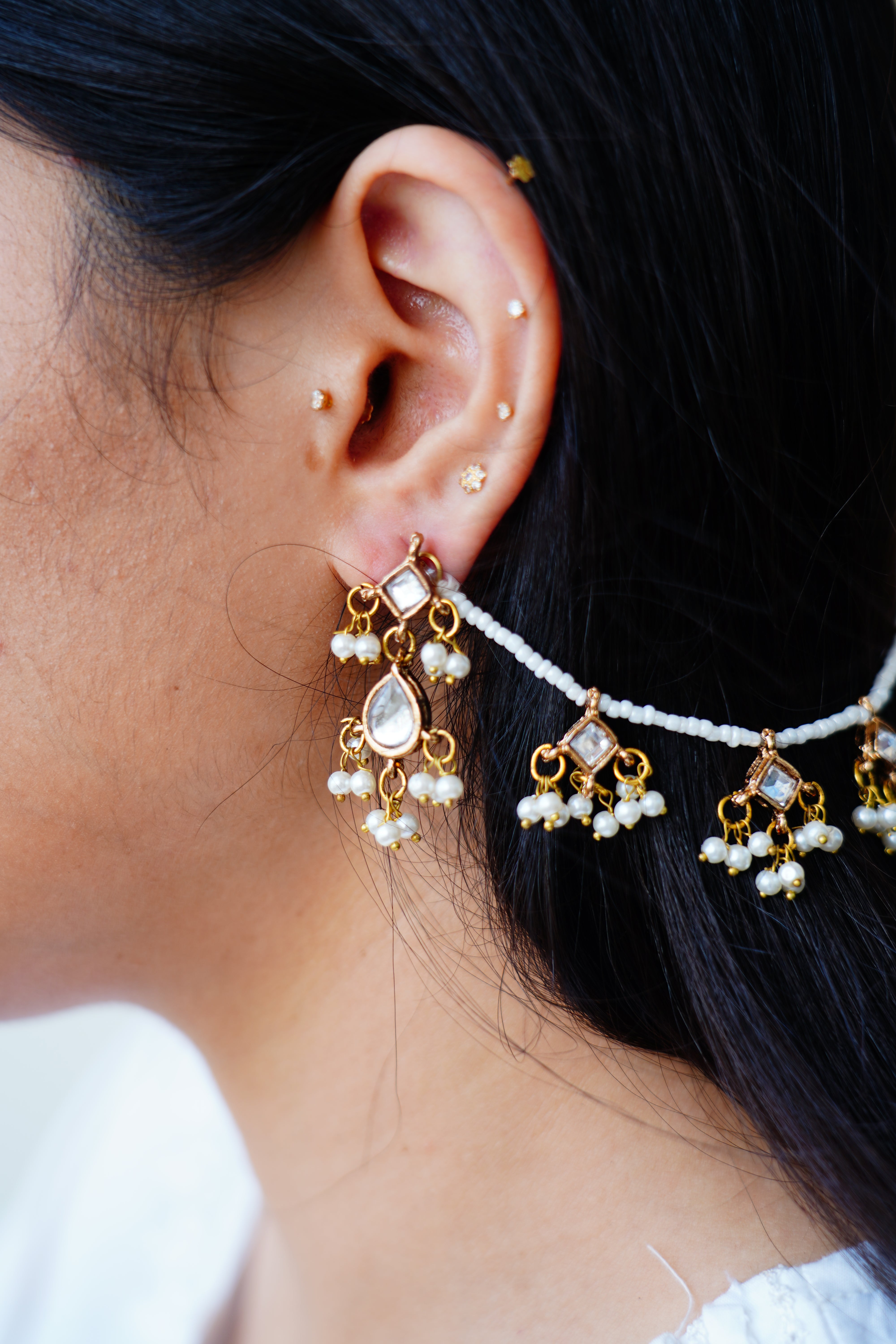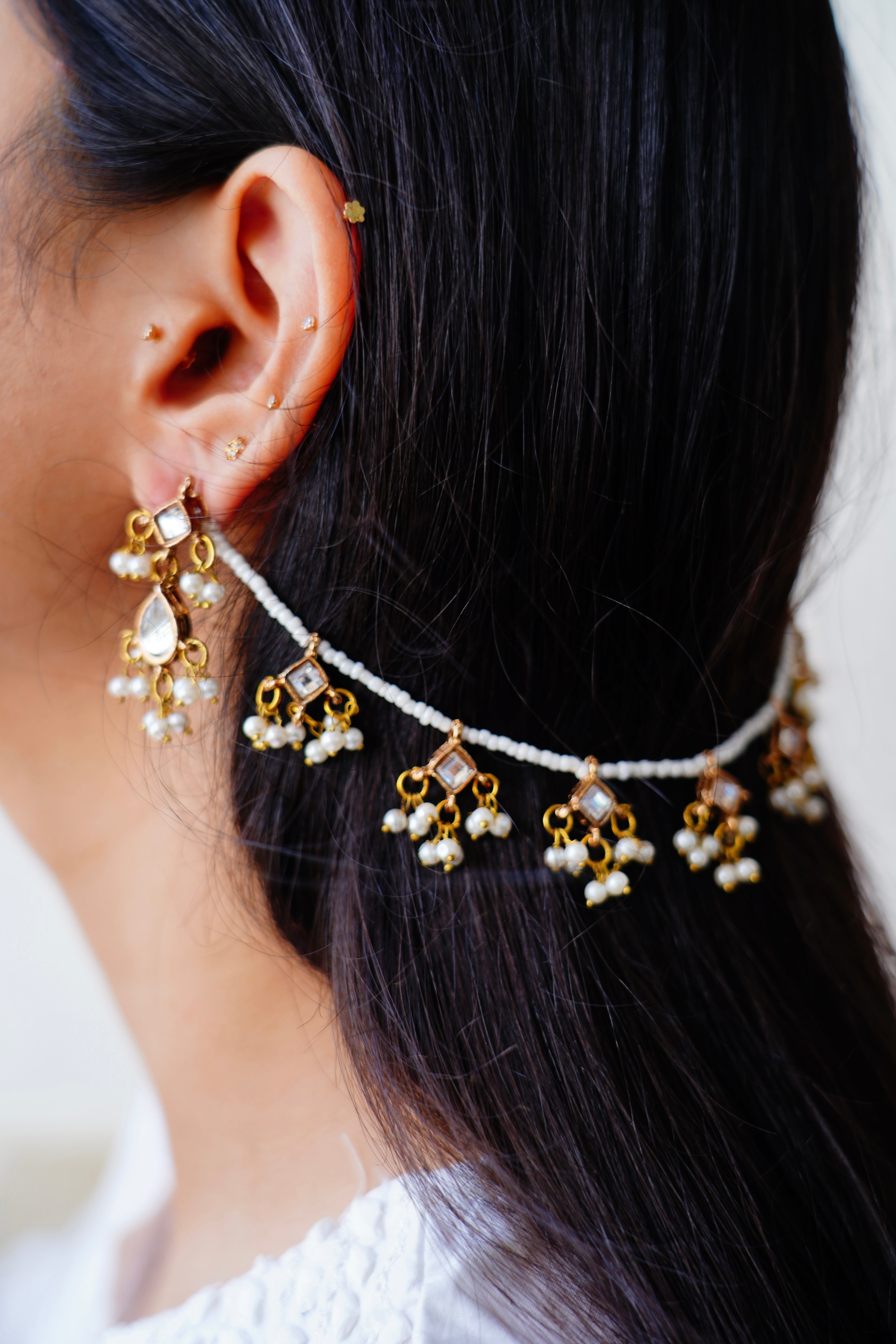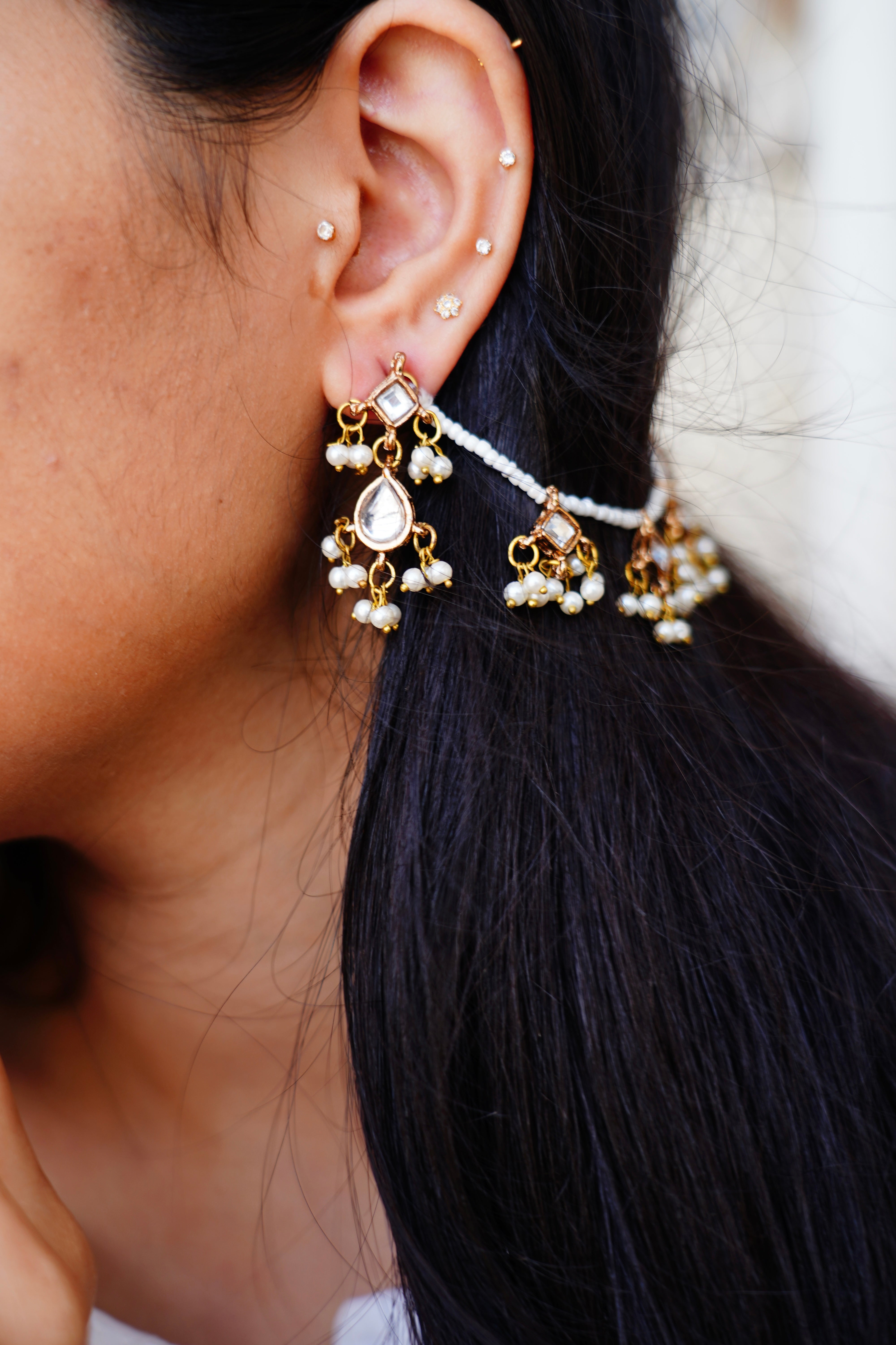 Kundan work blended with pearls. Mini jhumkis paired with beautiful removable saharas that could be styled in multiple ways.