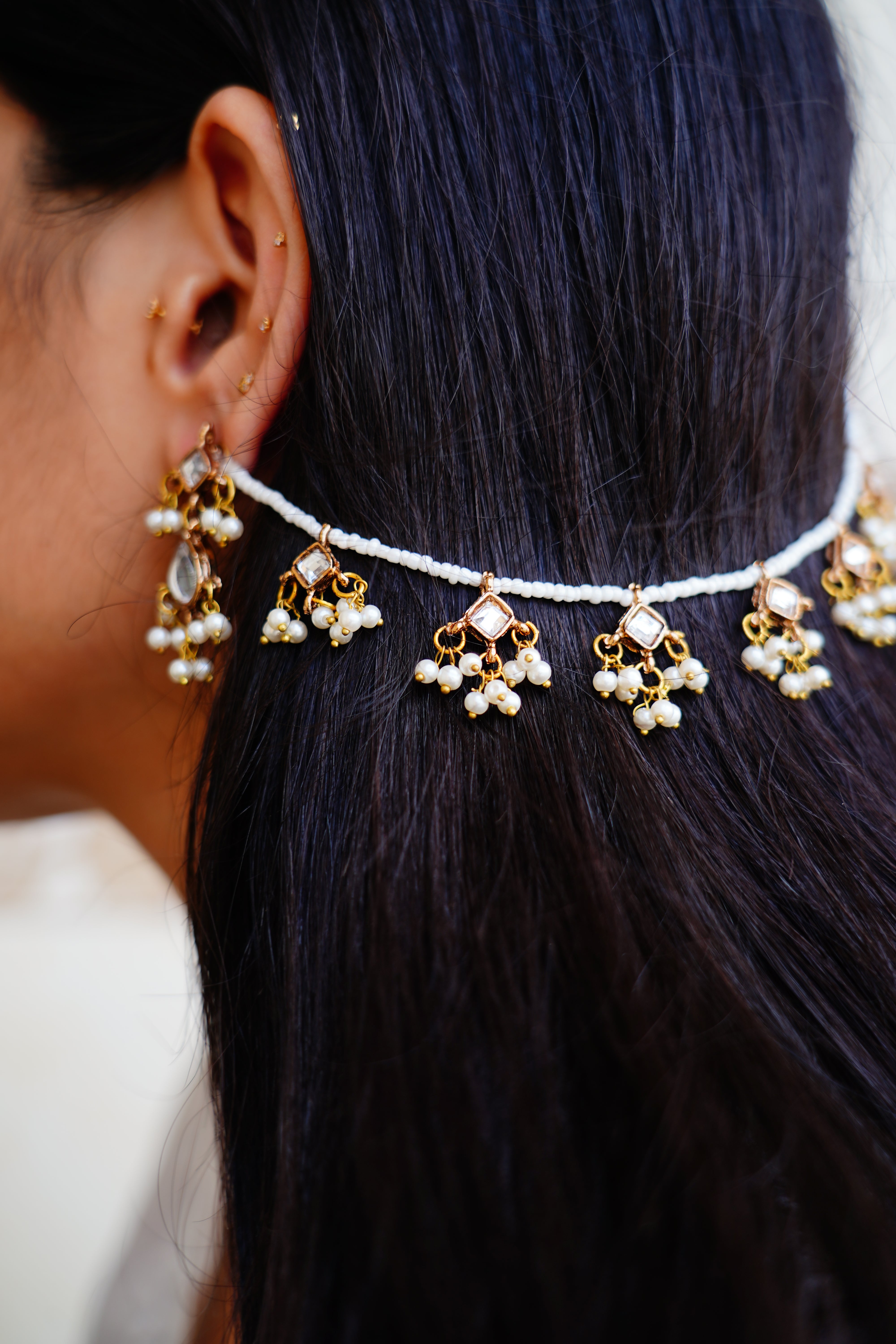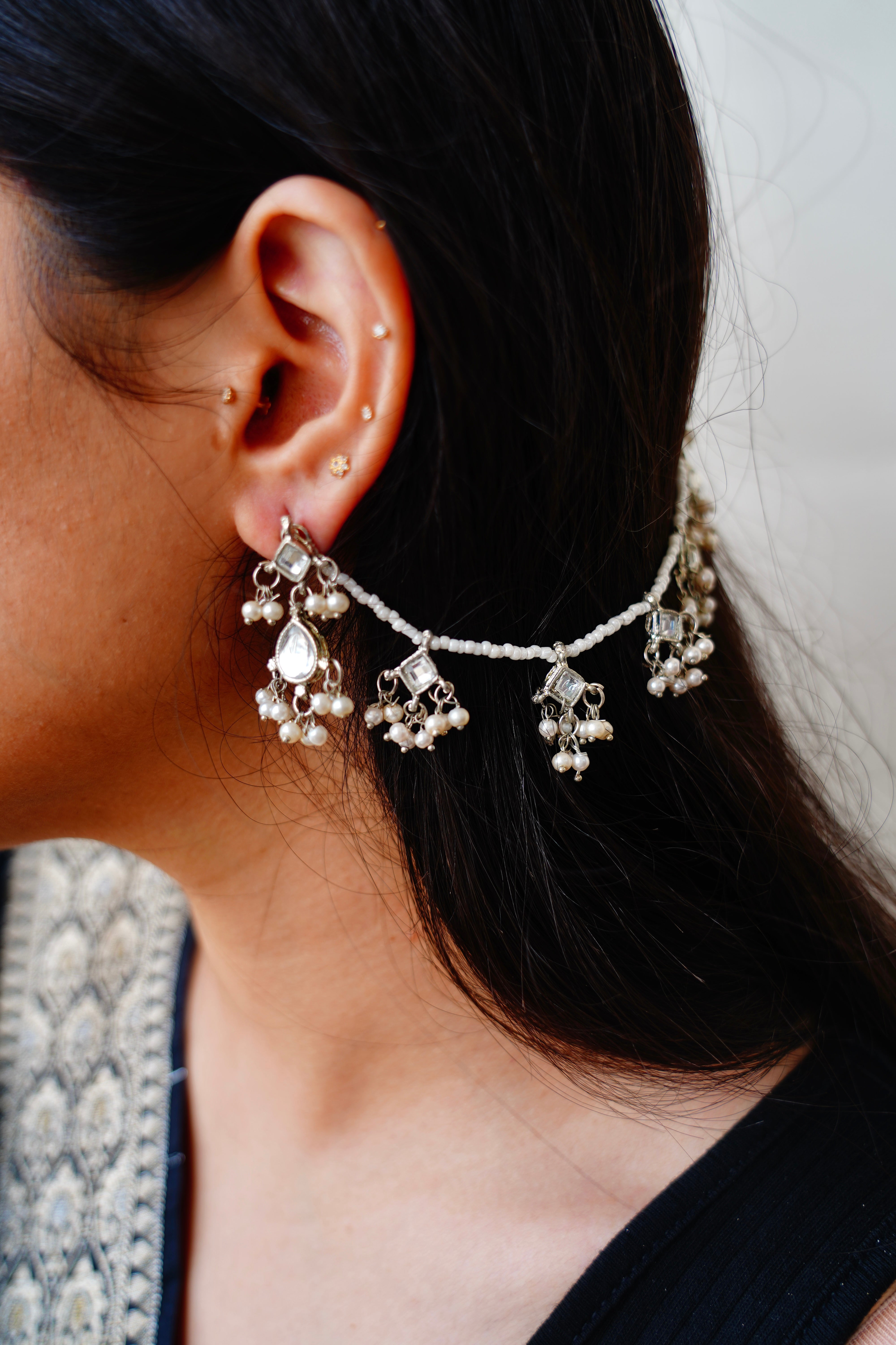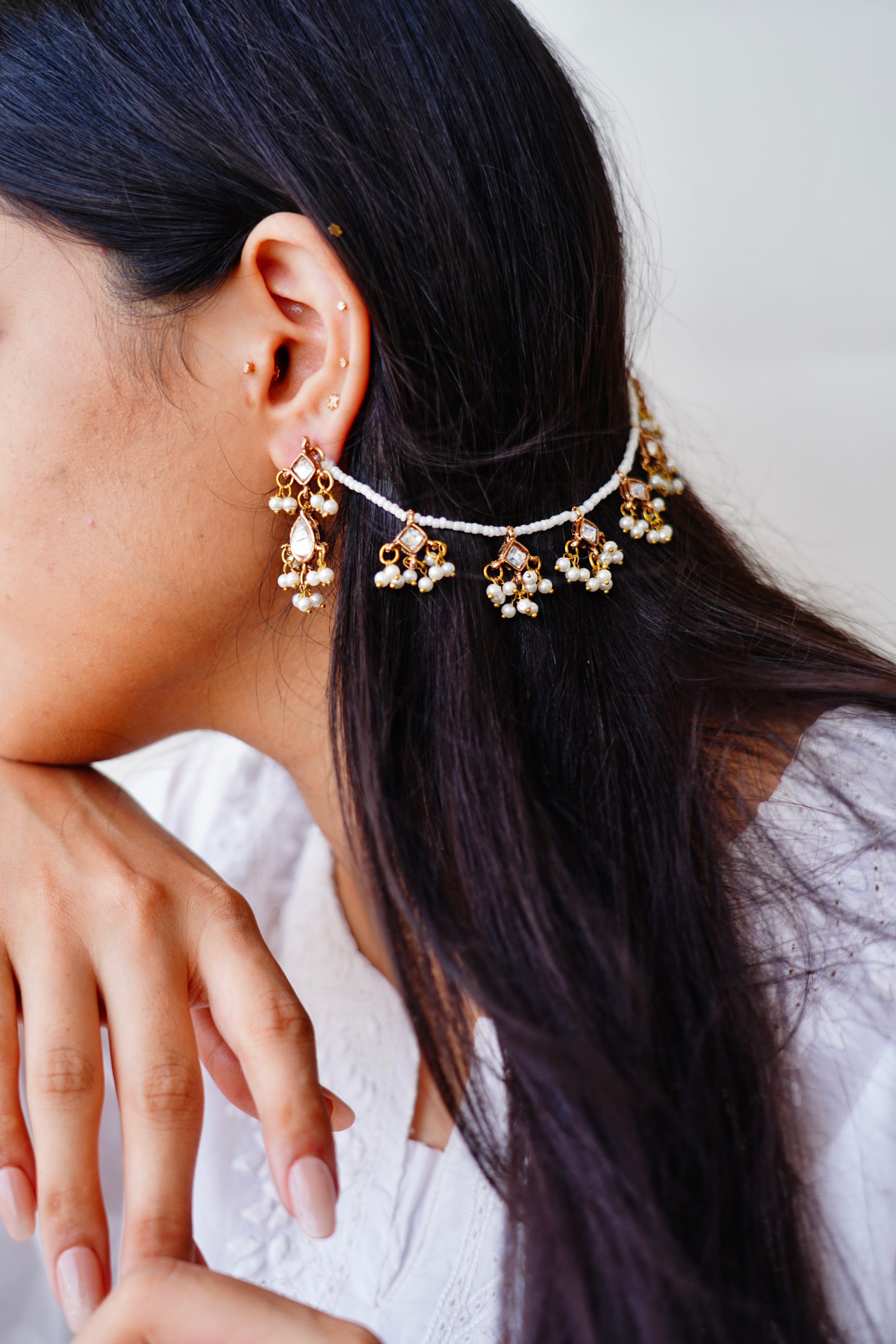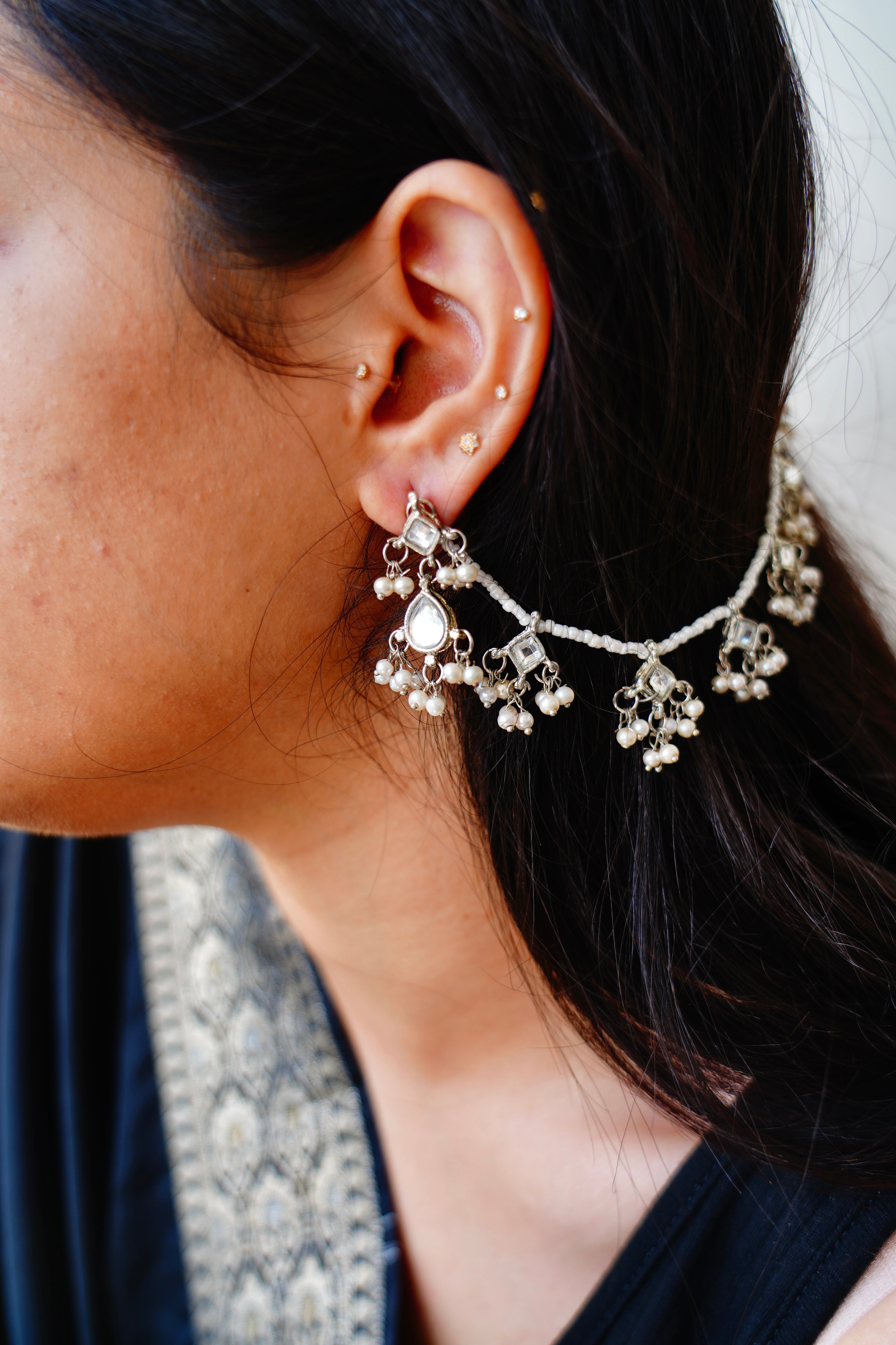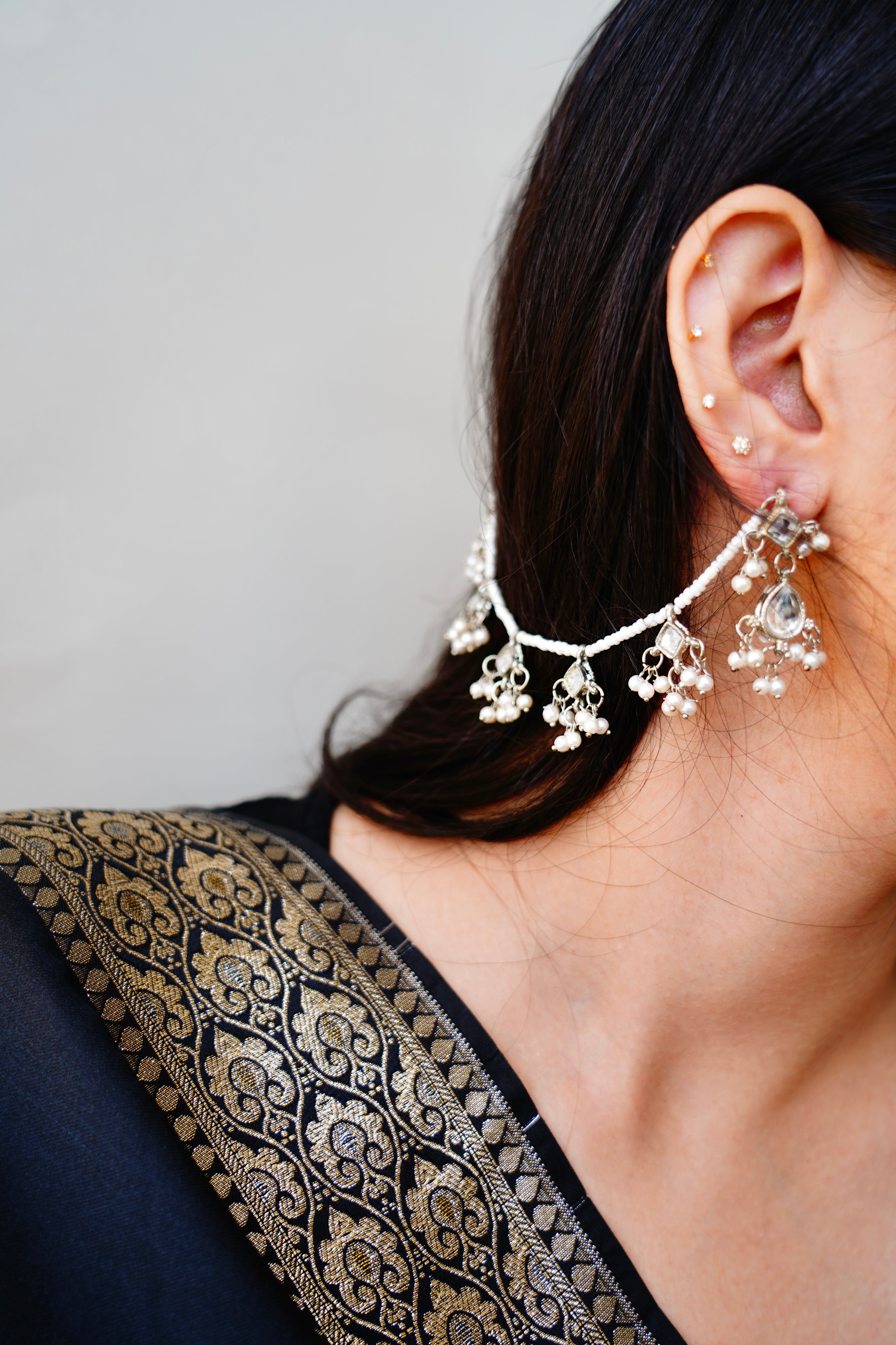 Kundan work blended with pearls. Mini jhumkis paired with beautiful removable saharas that could be styled in multiple ways.